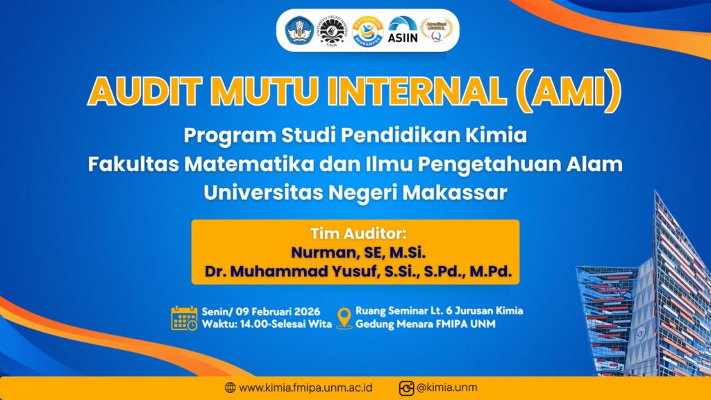 Program Studi Pendidikan Kimia, Fakultas Matematika dan Ilmu Pengetahuan Alam (FMIPA), Universitas Negeri Makassar (UNM) baru saja melaksanakan kegiatan Audit Mutu Internal (AMI). Kegiatan ini berlangsung dengan khidmat di Ruang Pertemuan Lantai 6, Jurusan Kimia FMIPA UNM.