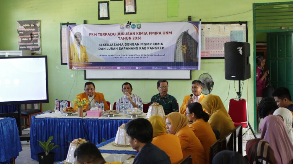 Pangkep, 25 April 2026 — Jurusan Kimia Fakultas Matematika dan Ilmu Pengetahuan Alam (FMIPA) Universitas Negeri Makassar (UNM) sukses menggelar kegiatan Pengabdian kepada Masyarakat (PKM) Terpadu di Kelurahan Sapanang, Kecamatan Bungoro, Kabupaten Pangkep, Provinsi Sulawesi Selatan, pada Sabtu (25/4). Kegiatan ini merupakan hasil kerja sama antara Jurusan Kimia FMIPA UNM, Musyawarah Guru Mata Pelajaran (MGMP) Kimia, serta Pemerintah Kelurahan Sapanang. PKM Terpadu tersebut melibatkan 14 kelompok pengabdi yang terbagi ke dalam dua fokus utama, yakni 7 kelompok bertema pendidikan dan 7 kelompok bertema sains.